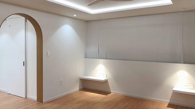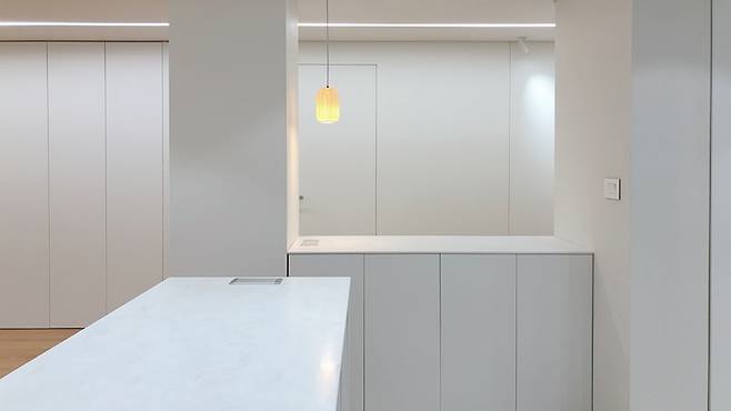 그리고 거실 비포사진에서 설명드렸는데 원래는 거실수납장 옆으로 방문이 2개 있었죠? 작은 방 2개가 연결되어 있었는데 둘은 하나의 방으로 만들고, 방문 1개는 없애 끝까지 수납장을 늘렸어요. 그래서 거실 수납장이 훨씬 더 늘어나는 효과가 생겼답니다. 거실 수납장은 푸시형태로 손잡이를 달지 않았어요. 얼핏 보면 벽 같은데 전부 문짝, 안쪽으로 수납공간이에요.