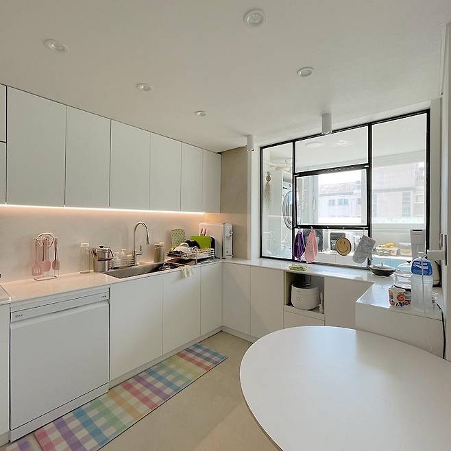 원래라면 이런 형태! 11자형 싱크대에 세탁실로 나가는 커다란 샷시가 있었죠. 주방 벽 뒤로 세탁실 가는 통로가 또 있었기에 굳이 여기에도 있을 필요가 없었어요. 공사할 때 주방가구 제작하시는 분이 불편하지 않겠냐고 하셨는데 살아보니 전혀 불편함이 없어요. 오히려 주방 수납공간이 조금이라도 더 늘어난 게 신의 한 수였습니다.