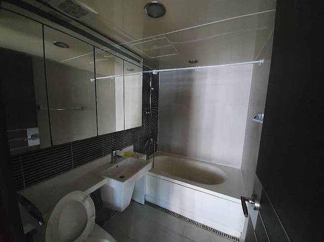 욕실 도어는 슬라이딩도어로 변경하고, 거울 설치 전 모습입니다. 안방 욕실이 가장 마지막에 완성됐어요.