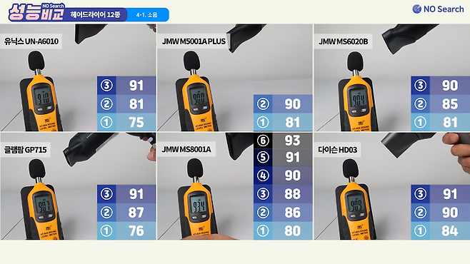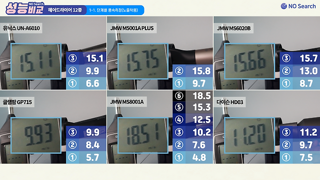 JMW 8001A가 가장 셌고, 다이슨, 유닉스, JMW 5001, 6020순으로 풍속이 빨랐습니다.