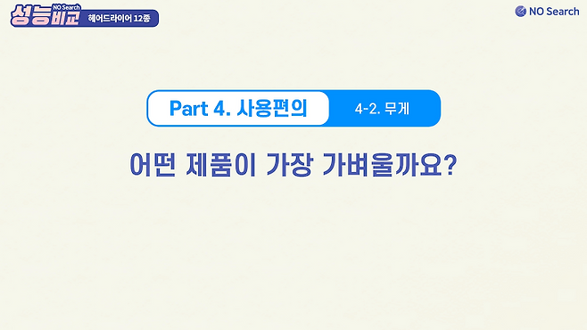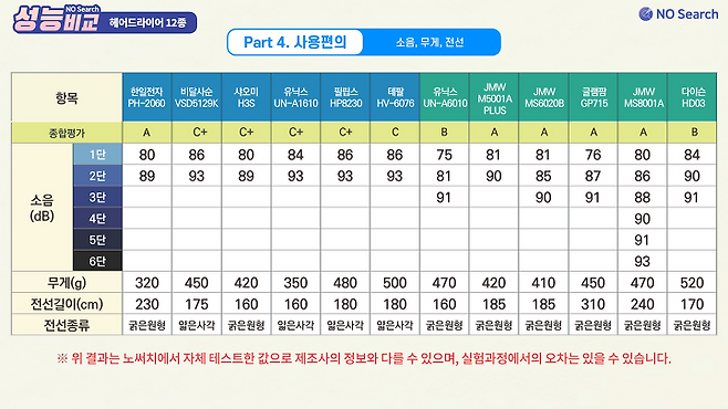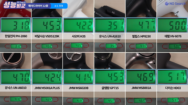 JMW 6020과 5001제품이 410~420g 정도로 가벼웠고, 다이슨은 520g으로 전체 제품 중 가장 무거웠습니다.