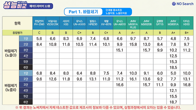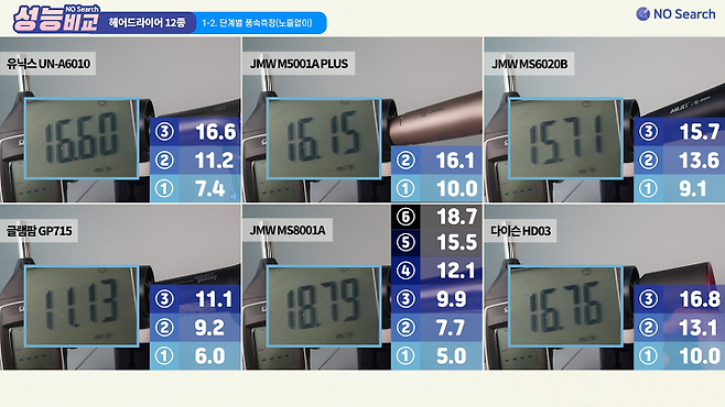 그 중에서도 JMW 8001 제품은 18m/s로 가장 강한 바람을 배출하였습니다.
