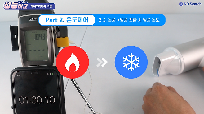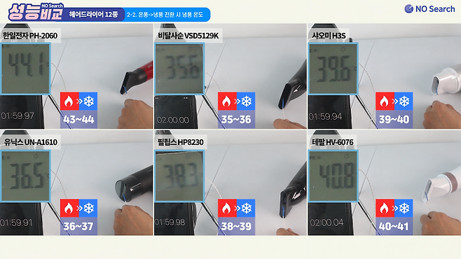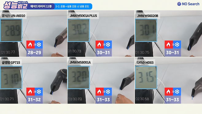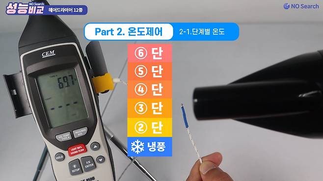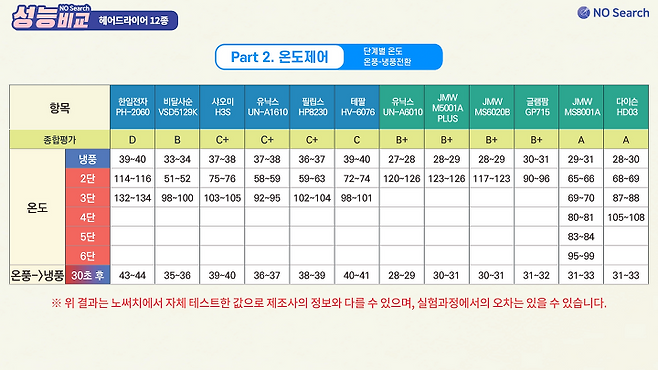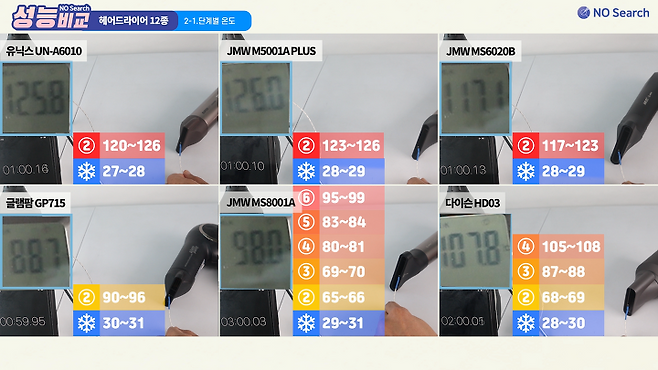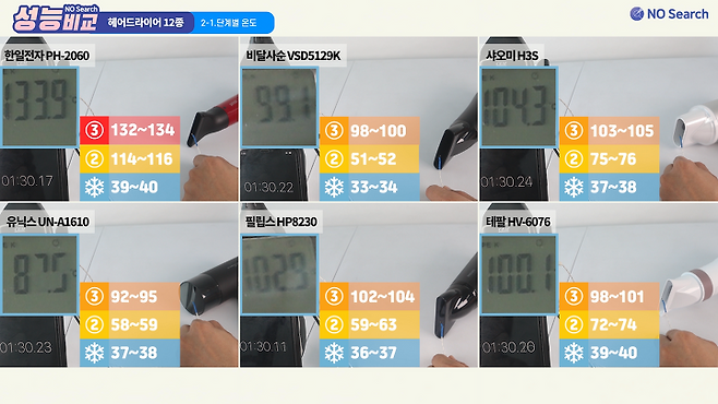 바람의 세기는 최대로 놓고 각 제품의 단계별 온도를 측정하였습니다.