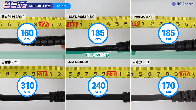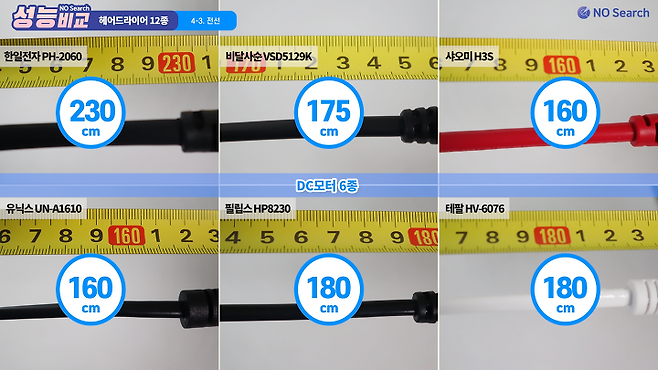 전선의 길이는 한일전자가 230cm 정도로 가장 길었고, 샤오미와 유닉스1610은 160cm 정도로 짧았습니다.