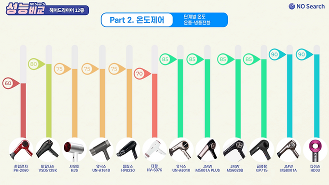 온도제어성능은 JMW 8001, 다이슨이 가장 우수했습니다.