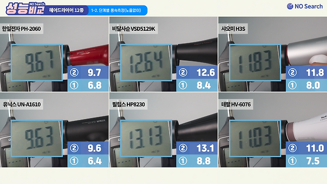 2단에서는 8~11m/s 였고, 샤오미와 필립스 제품의 풍속이 가장 높았습니다.