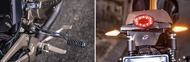 일자형 갈색 시트는 울프 125의 이미지에 엇나가지 않는 무난한 디자인으로 호불호가 크게 갈리지 않을 것 같다. 공랭 엔진인 만큼 냉각핀이 마련되어 있으며 클러치 케이스와 풋 패그, 텐덤스텝은 황동색으로 대비시켜 조형미를 살렸다. 무광 배기머플러는 엔진 하부를 지나가는 무난한 디자인으로 바이크 상단부의 멋이 더욱 부각된다.