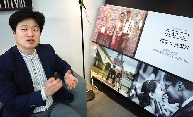 이윤배 대표가 휴대전화를 조작하자 음악이 흘러 나왔지만 사무실 안에 스피커는 보이지 않았어요. 이 대표의 안내를 받아 액자 하나에 손바닥을 갖다 대자 진동이 느껴졌어요. 그림판 자체가 사람 성대처럼 진동해서 소리를 내는 블루투스스피커 였어요.
