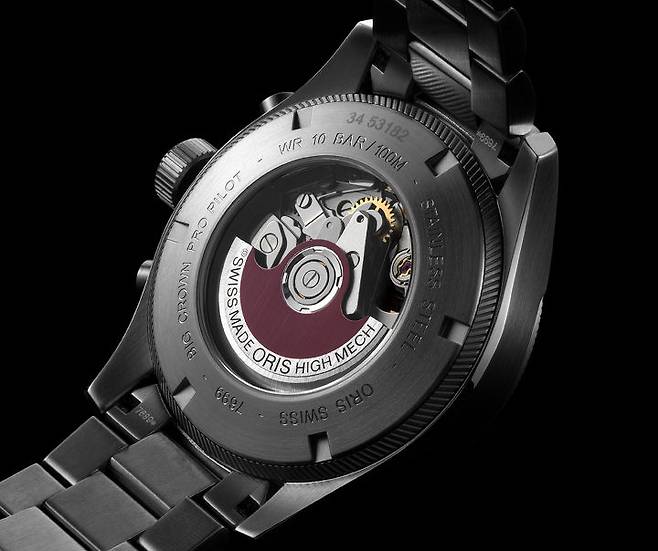 셀프와인딩 칼리버 오리스 774의 베이스 무브먼트는 ETA 7750의 클론인 셀리타 SW500입니다. ETA의 무브먼트 공급 중단 선언 이후 오리스는 셀리타로부터 무브먼트를 공급받고 있습니다. 별 다른 장식이 없는 무브먼트는 날 것에 가깝습니다. 품질이 우수한 시계를 합리적인 가격에 제공한다는 오리스의 경영 이념에 따른 겁니다. 오리스가 경쟁하는 세그먼트에서는 무브먼트의 장식보다는 안정적인 성능이나 외장의 마감을 중시합니다. 플레이트나 브리지에 장식을 한다고 성능이 좋아지진 않습니다. 그렇다 해도 조금 심심한 기분이 드는 건 어쩔 수 없습니다. 다행히 2002년부터 브랜드의 트레이트마크가 된 빨간 로터가 이런 허전함을 채워줍니다. 시간당 진동수는 28,800vph(4Hz), 파워리저브는 48시간입니다.