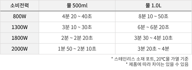 소비전력이란 단위시간에 사용되는 전력량으로 소비전력이 높은 제품이 같은 시간에 더 많은 전력을 사용하여 물을 빨리 끓일 수 있습니다.
