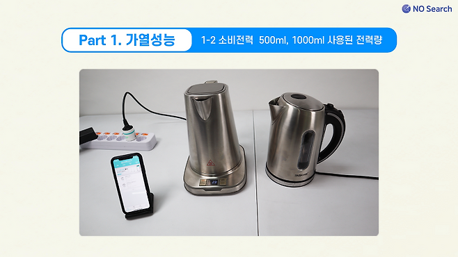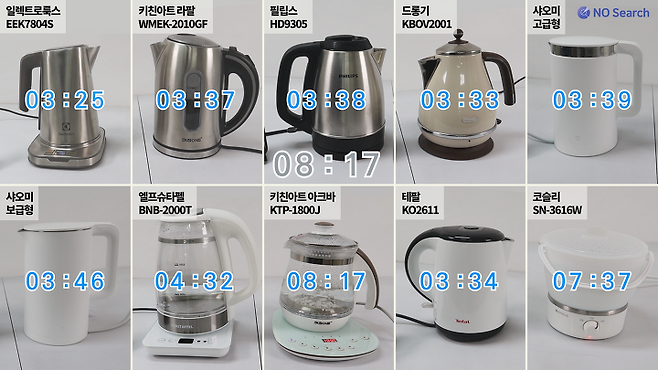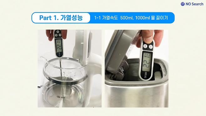 테스트 결과 같은 스테인리스 소재의 제품 중 소비전력 1800W 이상의 제품은 커피 2잔(500ml) 기준 2분 내외, 물 1L 기준 3분 40~50초 내외로 끓였고, 소비전력 800W인 제품은 2배 이상 시간이 걸렸습니다.