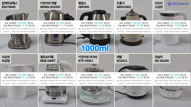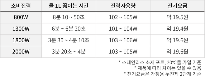 소비전력이 높은 제품일수록 빠른 시간에 물을 끓일 수 있어 편리하며, 전기요금 차이는 없습니다.