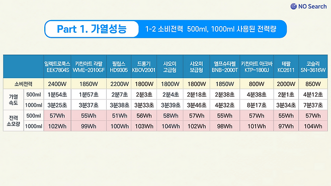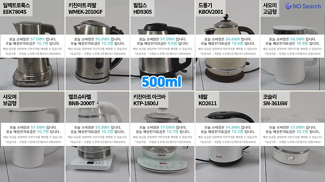 500ml 물 가열 시 10개 제품의 전력소비량은
