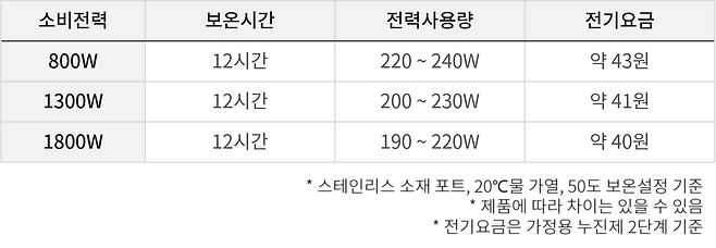 오히려 보온에 대한 전기 요금이 걱정된다면, 소비전력이 아닌 스테인리스+플라스틱 이중 소재의 제품이나 밀폐하여 보관이 가능하여 열 손실을 줄일 수 있는 구조의 제품을 선택하는 것이 좋습니다.