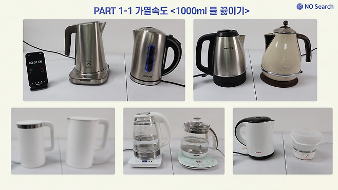 테스트 결과 같은 스테인리스 소재의 제품 중 소비전력 1800W 이상의 제품은 커피 2잔(500ml) 기준 2분 내외, 물 1L 기준 3분 40~50초 내외로 끓였고, 소비전력 800W인 제품은 2배 이상 시간이 걸렸습니다.