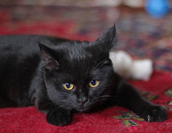 다만 고양이 치고 몸이 무거운 편입니다. 얼굴형태와 눈, 귀는 둥글동글하고 금색의 눈에 검은 눈동자를 하고 있어요.