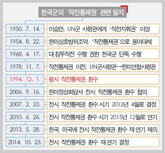 1994년 12월 1일 제24차 한미연례안보협의회(1992)의 합의에 따라 미국이 보유하던 한국군의 평시 작전통제권이 한국군에 공식 반환됐다. 한국전쟁 발발 직후인 1950년 7월 17일 이승만 대통령이 맥아더(Douglas MacArthur) 국제연합군 사령관에게 위임, 이양됐던 ‘작전지휘권(operational commands)’의 ‘절반’이 44년 만에 환수된 것이다.