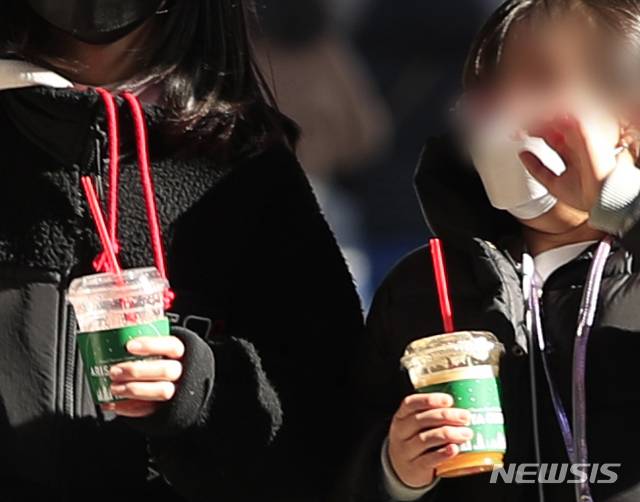 [서울=뉴시스]박민석 기자 = 서울 지역 기온이 영상권을 회복한 20일 오후 서울 청계천에서 아이스 커피를 손에 쥔 시민들이 걷고 있다. 2021.01.20. mspark@newsis.com