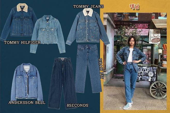 와이드 한 핏의 데님 팬츠와 청자켓을 매치해준다면