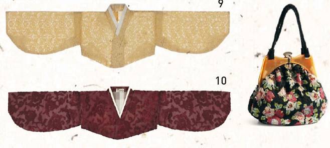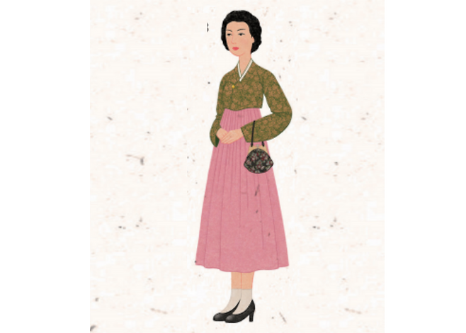 서구 문물의 영향으로 한복에 서양 스타일이 더해졌어요. 길어졌던 저고리의 길이가 조금 짧아졌고 앞뒤 길이에 차이를 뒀는데요. 저고리의 도련과 소매의 곡선은 더 둥글게 변화했고 깃 너비도 넓어졌어요. 저고리의 고름은 리본처럼 묶기도 하고 브로치로 여밈을 대신했습니다. 신발도 전통적인 운혜 외에 구두를 즐겨 신기 시작했는데요. 특히 고무신은 가죽신보다 경제적이고 편리해 대중화됐어요. 한복 주머니 대신 들기 시작한 가방은 1960년대에 이르러 클러치백(어깨끈이나 손잡이가 없는 작은 손가방)의 형태로 유행했습니다.