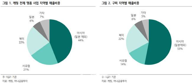 구찌는 아시아(일본제외)에서 78% 급성장을, 미국에서 51%로 성장세가 두드러졌지만, 유럽에선 -36%로 부진하며 코로나 이전인 2019년 1분기 수준을 회복하지 못했다.