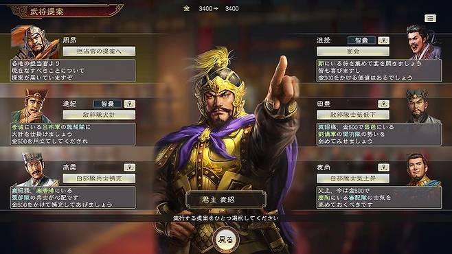 ‘제안’은 매 턴 이루어지며, 결재 커맨드에서 확인할 수 있다. 모두의 의견을 토대로 무엇을 실행할 것인지를 결정하는 것도 내정의 일환이라고 할 수 있다. 주위의 상황에 따라 적절한 선택이 승리를 향한 길을 열어준다.