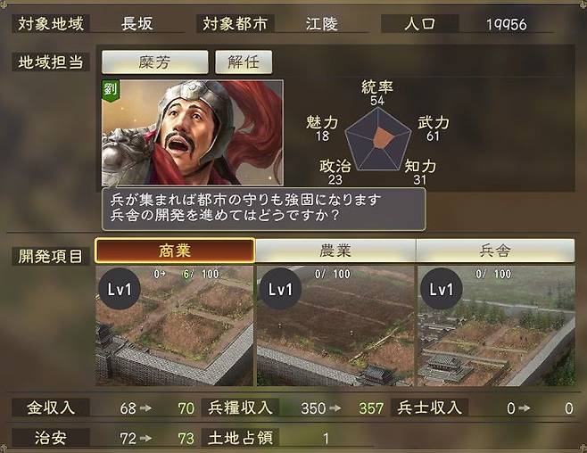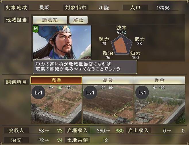 이번 작품에서는 도시를 구성하는 각 지역에 돈 등의 수입이 설정되어 있어, 각 지역의 ‘마을’에 지역 담당관을 임명하면 그 지역의 개발(상업이나 농업)을 진행하고 돈 수입 등을 증가시킬 수 있다. 그때, 지역 담당관의 능력이나 개성에 따라 특기인 개발 분야가 다르기 때문에 어느 지역을 어떻게 개발시켜 나갈 것인가도 포함하여 무장과 지역을 어떻게 선택하는지가 부국강병으로의 지름길이 된다.