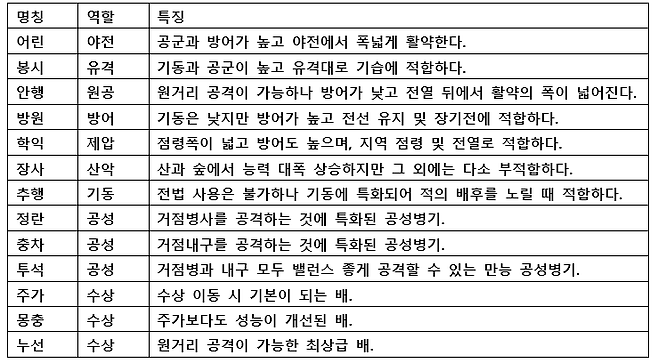 또한 수상에서는 진형은 반드시 ‘배’가 된다. ‘배’에는 시정에서 수군을 강화하지않아도 운용 가능한 ‘주가’, 주가보다 성능이 향상되고 시정에서 수군을 강화하면 운용 가능하게 되는 ‘몽충’, 시정에서 수군을 최대까지 강화하면 운용할 수 있게 되는 원거리 공격 가능한 최상급 배 ‘누선’이 있다. 수군의 정책에 뛰어난 오군은 상위의 ‘배’를 자유롭게 사용하며, 또한 오군에게는 개성 ‘수전’이나 ‘조타’를 가진 무장이 많기 때문에 장강에서의 오군은 경이로운 강함을 자랑한다. 적은 군으로 대군을 이긴 적벽대전을 재현하는 것도 꿈이 아니다.