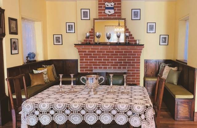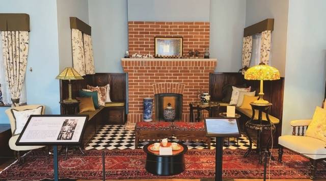 1층 내부 거실로 들어가니 당시 실내 사진 자료를 토대로 내부에 탁자와 시계, 벽난로, 은촛대, 꽃병, 거울 등을 그대로 배치해 놓았어요. 이 가구와 공예품은 1800년대 후반부터 1900년대 초반까지 만들어진 고가구를 구매해 재현했는데요. 구할 수 없는 일부 가구는 사진 모습 그대로 제작했습니다. 1층 거실은 테일러 부부가 지인들을 초대해 연회를 여는 공간이었죠. 그 기능에 맞게 중앙에는 커다란 식탁이 있었어요. 재깍거리는 소리가 굉장히 크다고 메리 테일러의 자서전에 기록된 괘종시계도 볼 수 있었습니다. 거실 벽면에는 커다란 벽난로가 설치돼 있었는데요. 벽난로 위에는 메리의 친정 가문 문장이, 벽난로 양쪽에는 조상들의 판화가 걸려 있었어요.