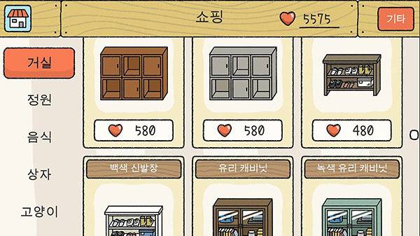 이렇게 모인 하트로 인테리어, 음식, 고양이 용품 등을 구매 가능하다. 책장, 신발장, TV, 선풍기 등 현실에서도 자주 보는 물건을 구매하면 더욱 몰입도가 높아질 조짐이다. 인테리어 외에도 다양하게 하트가 쓰일 예정이기에 많이 모아둘 필요가 있다. 하트는 꼭 고양이를 쓰다듬으며 얻는 것이 아니라 광고 시청을 통해서도 획득 가능하다.
