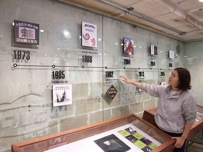 “잘 성장해왔고, 계속 성장 중인 토종 아웃도어 브랜드가 있다.” 코오롱스포츠가 젊은 소비자에게 어필하고 싶은 부분이다. 공간 한편에 처음 나이론 원사를 국산화한 것, 신발끈 ‘헤라클레스’가 가장 강하고 질긴 신발끈으로 기네스에 오른 것, ‘Ver.09 라이프텍 재킷’이 2020 레드닷 디자인 어워드에서 수상한 것 등 코오롱의 역사를 적어두었다. 고객들로부터 재구매한 70~80년대 헤리티지 제품들도 전시해놓았다.