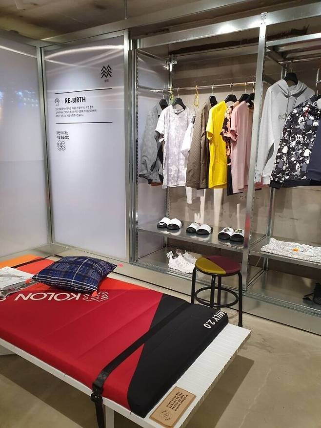 또, 코오롱의 슬로건인 ‘자연으로 가는 좋은 방법(Best way to nature)’을 공간을 통해 보여준다. 솟솟618과 솟솟상회 모두 인테리어에 폐자재가 활용됐다. 솟솟상회의 경우 오픈 즈음 문을 닫은 코오롱 청담직영점을 철거하며 나온 자재들을 가져와 재활용했다. 청담점 벽면이 솟솟상회에선 입구와 계산대 그리고 벤치가 됐다. 또, 만든 지 3년이 지나 소각 대상인 재고를 가져다 리폼한 제품을 판매한다. 그리고 이를 적극적으로 알린다. 김 팀장은 “매장 전체가 자연으로 가는 방법을 소개하는 셈”이라고 말했다.