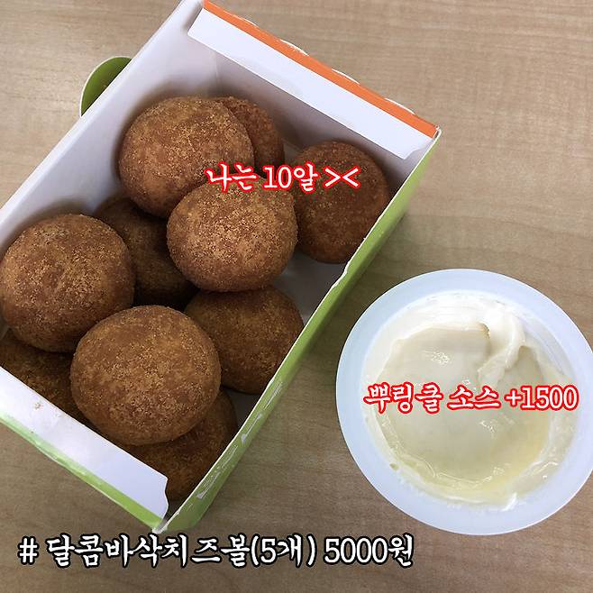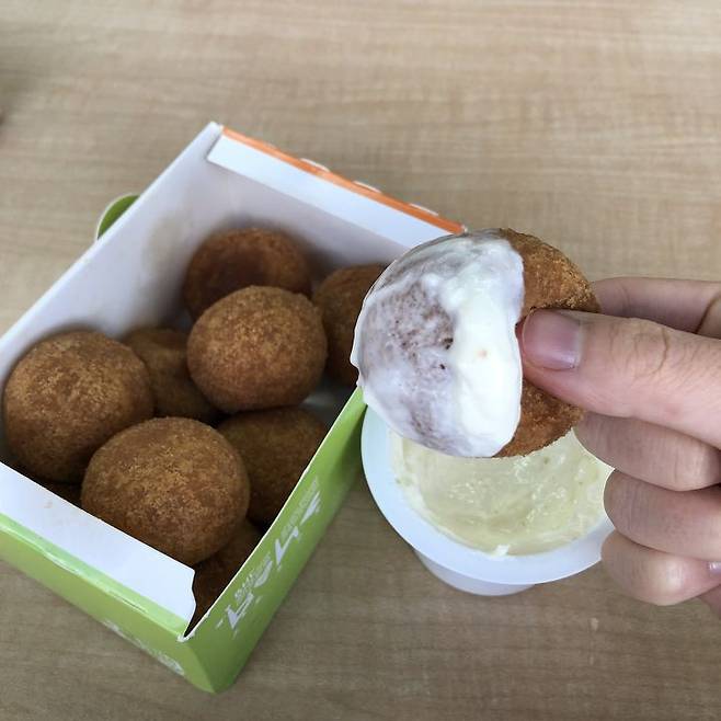 시장에 파는 찹쌀도넛 안에 팥 대신 치즈가 들어간 맛! 딱 그 맛인데 추가로 주문한 상큼한 뿌링클 소스와의 조화가 아주 찰떡임ㅠㅠㅠㅠㅠㅠㅠ