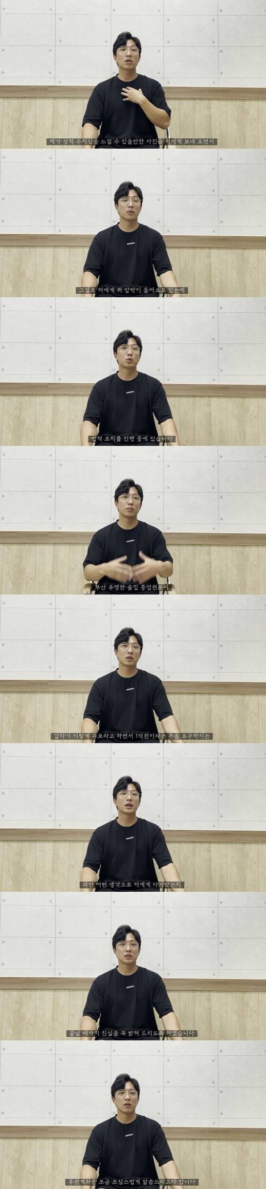 박중사는 "사실 3년, 4년 시간이 지난 상황에서 갑자기 이렇게 유포라고 하면서 1억원의 돈을 요구하는 부산 유명한 술집 종업원이 과연 어떤 생각으로 제게 다가왔는지 저 역시도 궁금하다. 진실을 꼭 밝혀드리도록 하겠다"라고 강조했다.