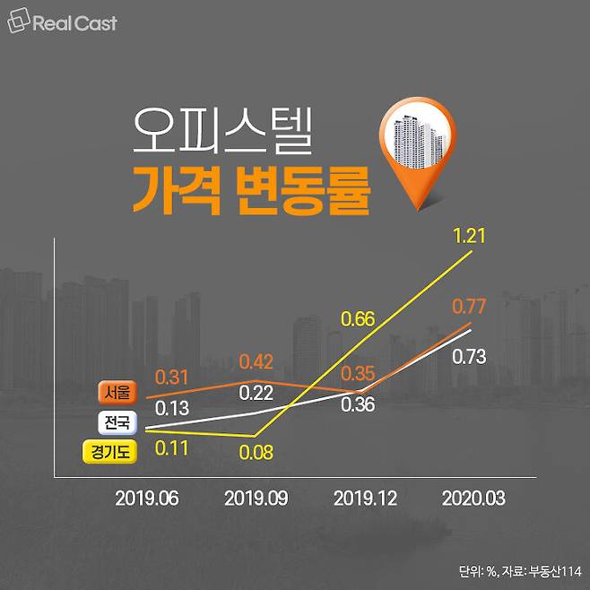 오피스텔 가격도 꾸준히 상승하고 있습니다. 부동산114에 따르면 올해 1분기 서울 및 경기도 오피스텔 가격 변동률은 각각 0.77%, 1.21% 상승했습니다. 2분기 역시 0.29%와 0.13%가 상승하며 코로나19 여파에도 견고한 상승을 이어가고 있습니다. 서울권의 상승에 힘입어 전국 오피스텔 가격 변동률 역시 1분기 0.73%, 2분기 0.21% 올라 지난 2018년 4분기(-0.06%) 마이너스 이후 0.1%대 머물던 변동률도 상승세 굳히기로 돌아선 양상입니다.