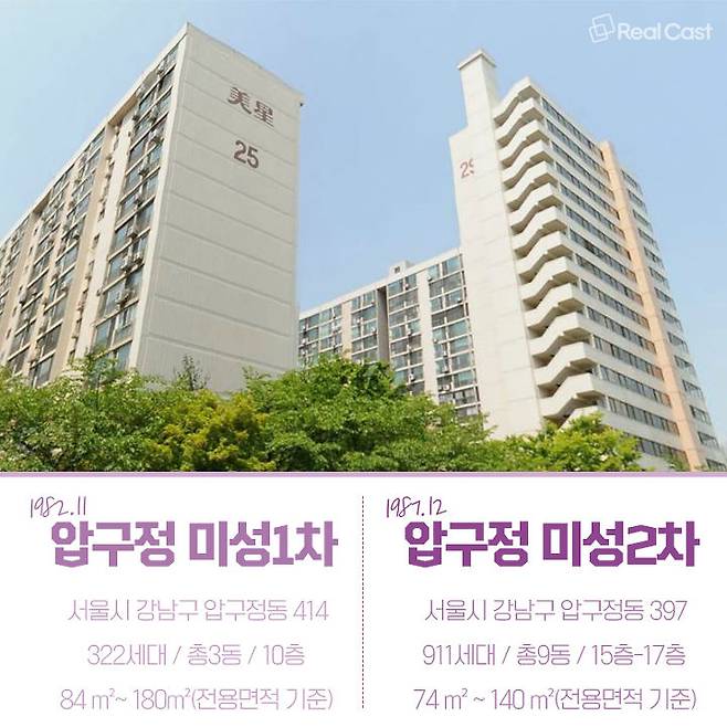 상황은 압구정 1,2차 미성아파트(이하 압구정 미성, 1987)도 다르지 않습니다. 한남대교 남단 압구정 노른자위로 평가받는 위치에 자리 압구정 미성은 압구정 현대아파트와 함께 30여 년간 지역을 대표하는 아파트로 불리는데요. 압구정 미성 1차 91㎡(전용, KB부동산 시세 기준)형이 21억2백만원에 거래되고, 180㎡형이 30억5천만원에 거래됐습니다. 1차 단지보다 세대수가 많은 압구정 미성 2차의 경우 91㎡형이 14억3천5백만원, 112㎡형이 16억9천만원, 162㎡형이 22억5천만원에 거래되며 최고가를 기록했습니다.