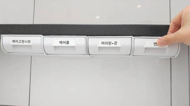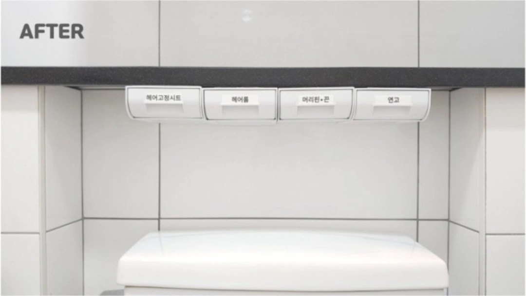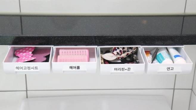 이제 여기 자잘한 물건들을 정리해볼게요. 저는 욕실 선반 아래 공간을 활용했어요.