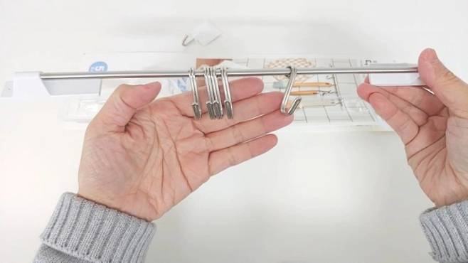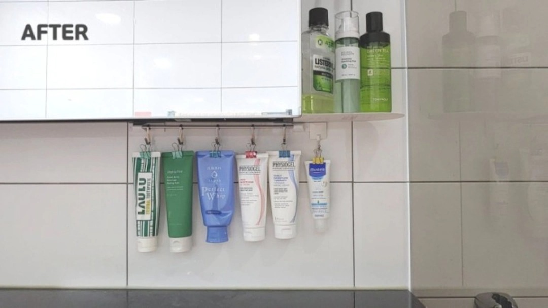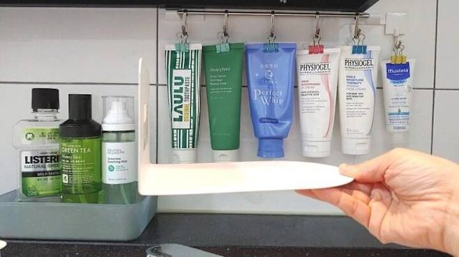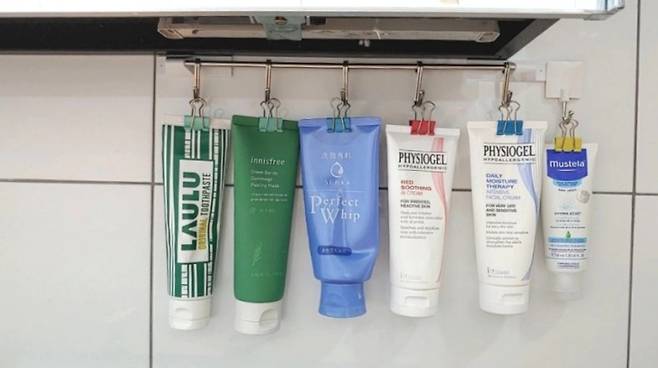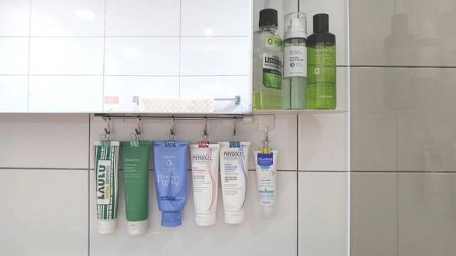 그래서 먼저, 튜브형 제품들을 공중에 걸어놓을 수 있는 스텐 주방 걸이를 활용해 보았어요. 가격도 저렴하고, 양면테이프로 붙이기만 하면 되니 설치가 간편해요.