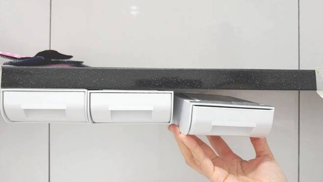 어떻게 하면 청소가 쉽고, 유지가 잘 될까요? 바닥에 닿거나 담아 놓는 수납보다는 공중에 띄운 상태로 수납을 하게 되면 물건을 넣고 빼기도 쉽고, 물때도 덜 생기게 됩니다.
