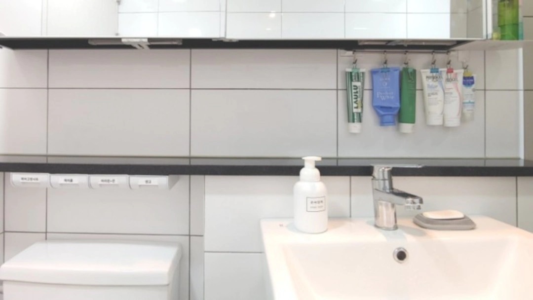 저희 집 욕실 여건에 맞는 맞춤형 수납으로 정리 정돈을 마친 욕실의 모습이에요.