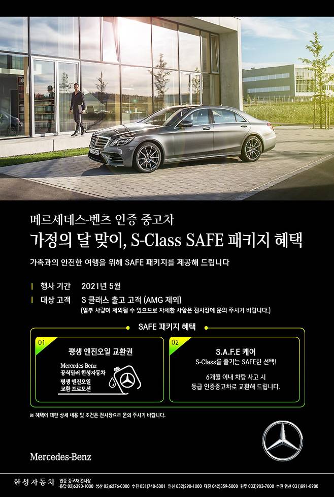 먼저, 전국 메르세데스-벤츠 한성자동차 인증 중고차 전시장에서는 5월 한 달 내 Mercedes-Benz S-Class 출고 고객을 대상으로 ‘SAFE 패키지’를 제공한다. 해당 패키지에는 6개월 이내 차량 사고 시 동급 인증 중고차로 교환할 수 있는 ‘SAFE 케어’ 및 평생 엔진오일 무상 교환 서비스가 포함되어, 패키지 이용 고객에게 보다 안전한 주행 라이프를 제안한다.