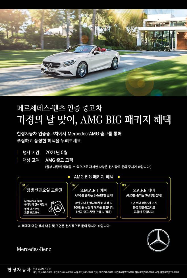 또한, 5월 내 한성자동차 인증 중고차 전시장에서 Mercedes-AMG 차량을 출고한 고객에게는 ‘AMG BIG 패키지’를 제공한다. 평생 엔진오일 무상 교환 서비스가 포함된 해당 패키지에는, 차량을 3년 이내에 한성자동차로 매각하고, 인증 중고차 신규 구입 시에 100만원 상당의 혜택을 제공하는 ‘SMART케어’, 그리고 1년 이내에 차량 사고 시 동급 인증 중고차로 교환할 수 있는 ‘SAFE케어’ 혜택이 포함되어, 안전과 함께 효율적으로 차량을 운행할 수 있다.