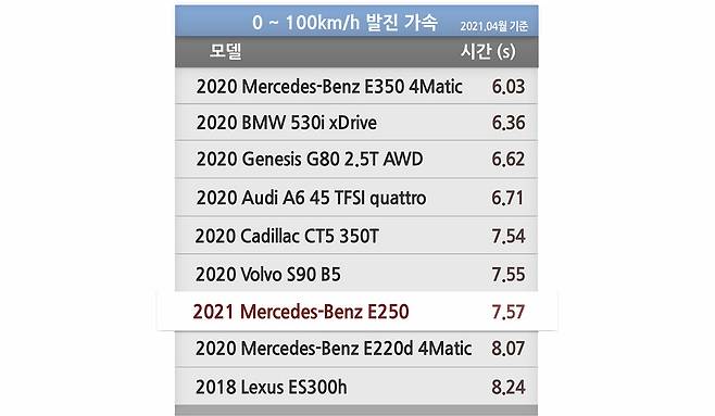 일상 영역에서 충분히 좋은 힘을 보였던 E 250. 가속 성능은 어떨까? 시험 결과 정지 상태에서 시속 100km까지 7.57초 기록을 냈다. E 220d(8.07초)보다 0.5초 빠른 가속 시간이다. 250마력을 넘어서는 동급 경쟁 모델들이 6초대에 진입하기도 했지만 211마력이란 수치를 감안하면 충분한 성능이다.