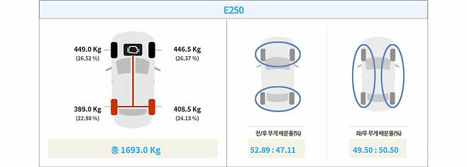 가벼운 무게도 한몫했다. E 250은 벤츠의 4륜 시스템인 4MATIC이 빠진다. 여기에 일부 부가 장비들도 덜어냈다. 우리 팀이 실측한 결과 1692.5kg의 몸무게를 보였다. E 350 4MATIC이 1856kg였으니 163kg 가량 줄어든 무게다.