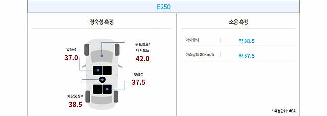 귀로 들어도, 계측기로 확인해도 마찬가지다. 전기형 모델인 E 300 4MATIC 익스클루시브 모델은 아이들 정숙성이 36.5dBA로 상당히 훌륭했다. 하지만 현재 E 250은 38.5dBA로 2dBA 가량 증가했다. 차량 중앙부 뿐 아니라 대시보드와 앞 좌석, 뒷좌석 모두 1dBA에서 2dBA까지 늘었다. 이유가 무엇일까? 벤츠가 전기차 모델 라인업을 늘리면서 내연기관 모델의 존재감을 알리려는 것일까?