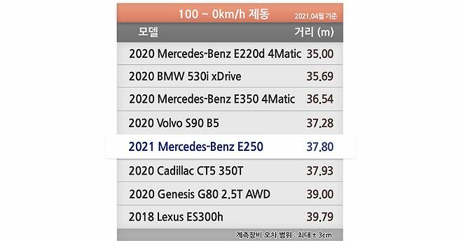 제동 테스트도 진행했다. 100km/h의 속도에서 정지하는데 이동한 최단 거리는 37.8m. 테스트를 반복한 후 나온 평균 거리는 38.1m였다. 밀려도 38.34m 수준으로 약 50cm 정도의 편차를 보였을 뿐이다. 매우 뛰어난 지속성이다. 이런 성능을 내려면 순수 제동 시스템, 타이어도 꾸준히 성능을 유지해 줘야 한다.