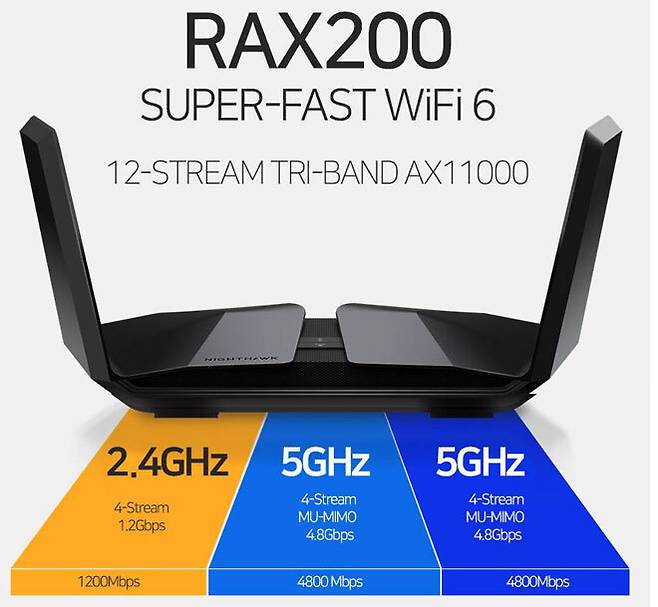 먼저 넷기어 RAX200은 굉장히 막강한 WiFi 성능을 보장해준다. WiFi 6를 기반으로한 AX는 물론이거니와 이를 바탕으로 2.4GHz 대역폭에서는 1.2Gbps(4,800Mbps)의 성능을 제공하며, 5GHz 대역폭에서는 최대 4.8GHz(4,800Gbps)의 대역폭을 갖고 있다.