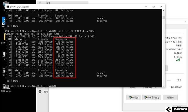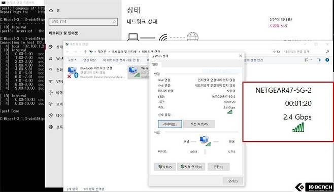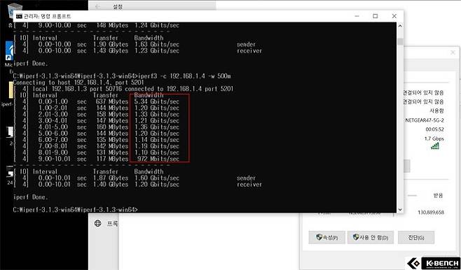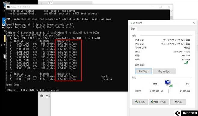 아무래도 유선이 아닌 무선 네트워크인 만큼 일부 데이터 손실이 있기에 온전한 2.4Gbits가 아닌 평균 1.5Gbits를 보여준 것으로 분석된다.