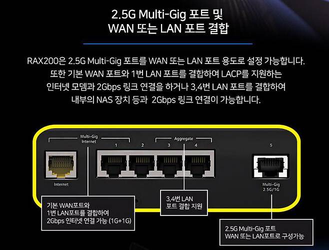 혹은 사용자가 2.5Gbps 유선 네트워크망이 있다면 5번 포트를 활용하여 WiFi는 물론 전반적인 유선 네트워크까지 2.5Gbps를 온전히 활용할 수 있으며, Wan 포트와 1번포트 그리고 3번과 4번 포트의 Aggregate를 통해 최대 2Gbps로 링크 연결이 가능하다.