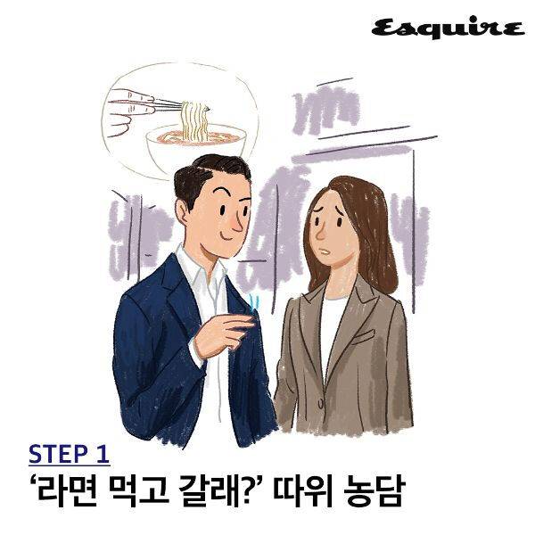 아무리 그녀가 마음에 들어도 진도는 천천히 나가자. 괜히 상대의 마음은 알지 못한 채 섣부른 야한 농담은 금물이다. 특히 장난 반 진심 반 ‘라면 먹고 갈래?’를 시전했다가 찬물 끼얹고 싶지 않다면 주의하는 게 좋다. 유쾌한 분위기를 이어가도 썸 단계는 썸 단계일 뿐. 차라리 가만히나 있으면 중간이라도 간다.